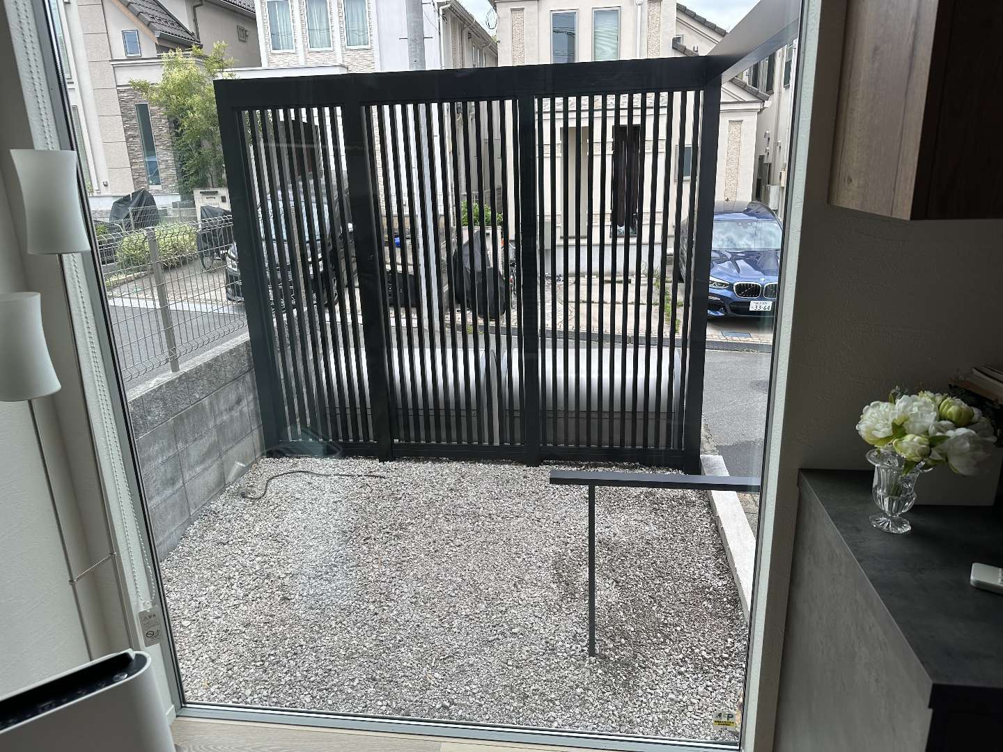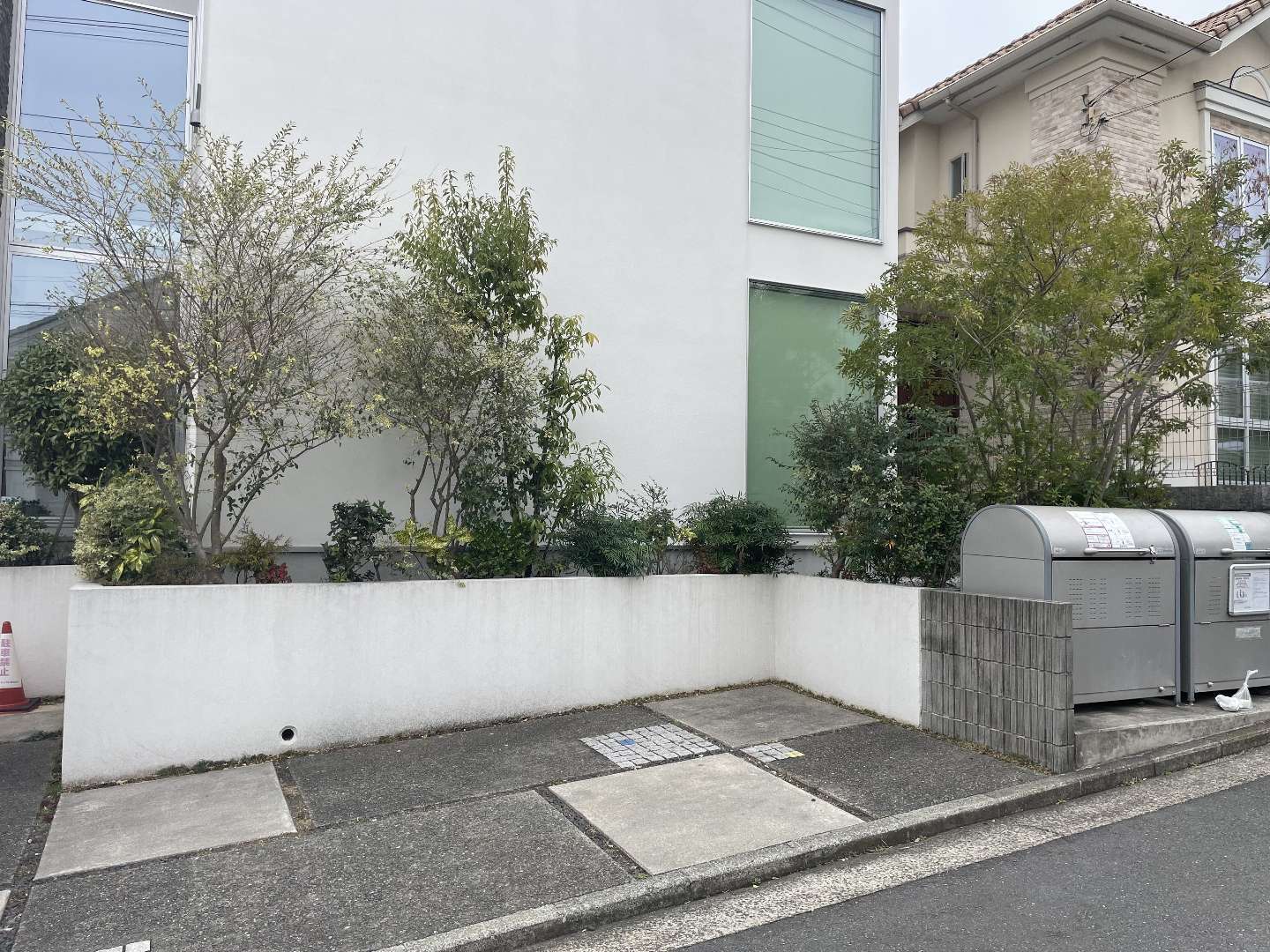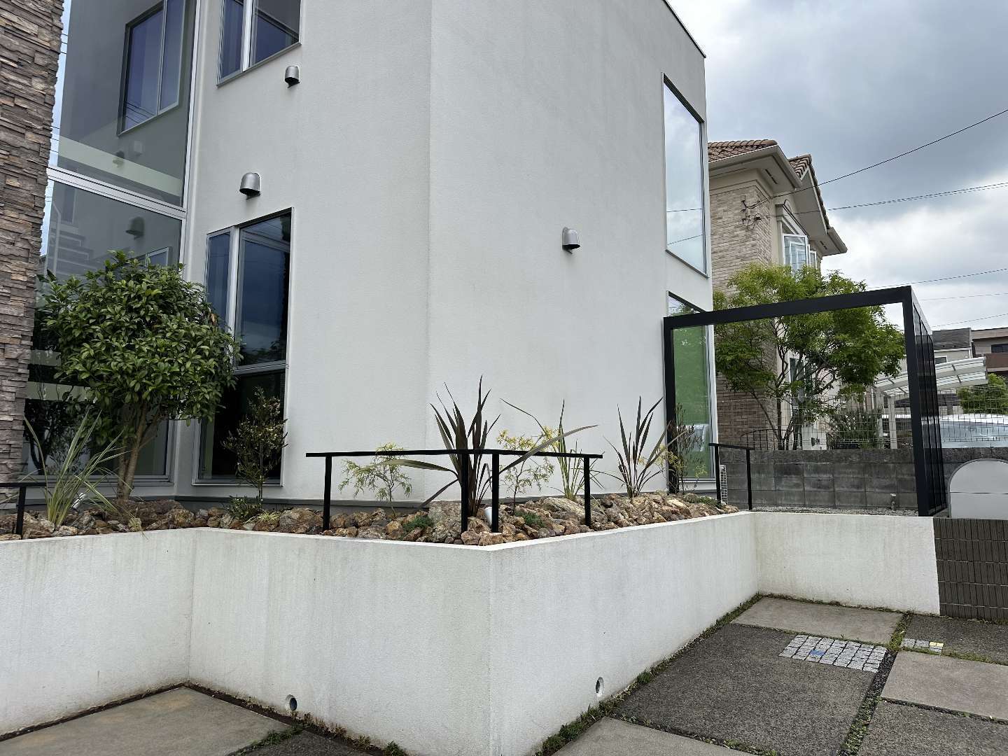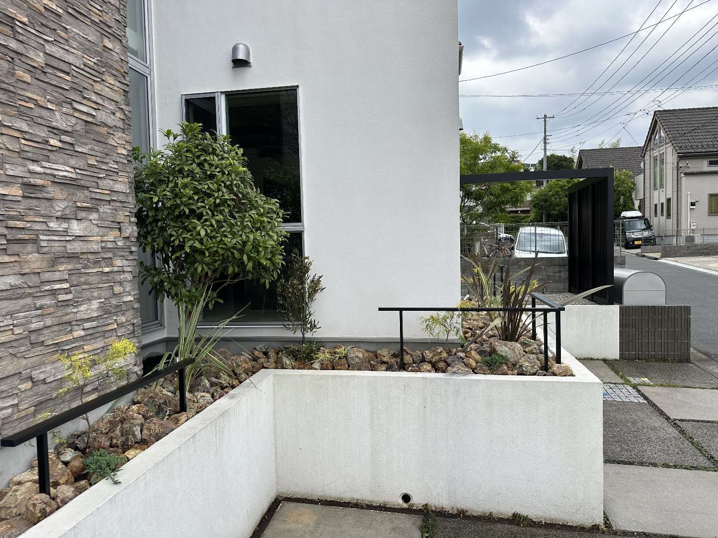 一部建物凹み部の植物は残したいとの事で現況のキンモクセイを残し、今迄の目隠しの役割としての植栽を、エクステリアの製品を代用し目隠しを作り、外部からの目線を外せる様にいたしました。