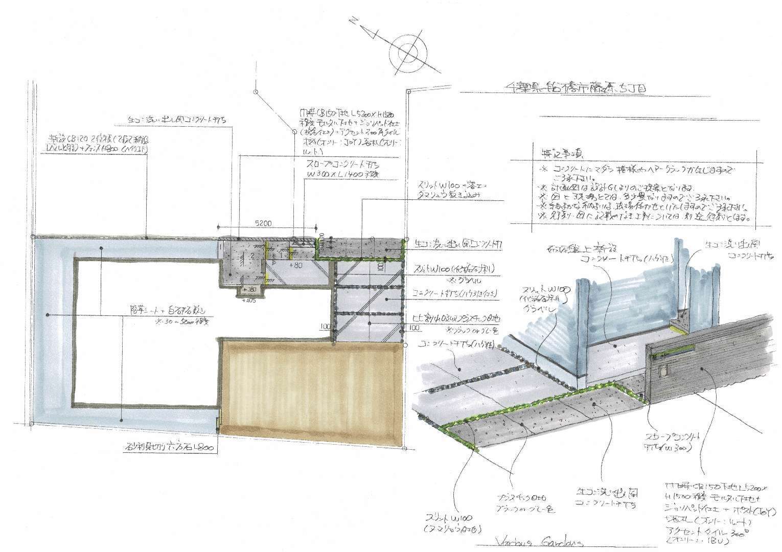 自社は、このプラン図にて職人さんに施工をしていただきます。このプラン図も、建物配置図1/100よりトレースし、配置図の高さから全て読み取り、駐車場の水勾配や、階段割付などを考えてプラン制作をしております。