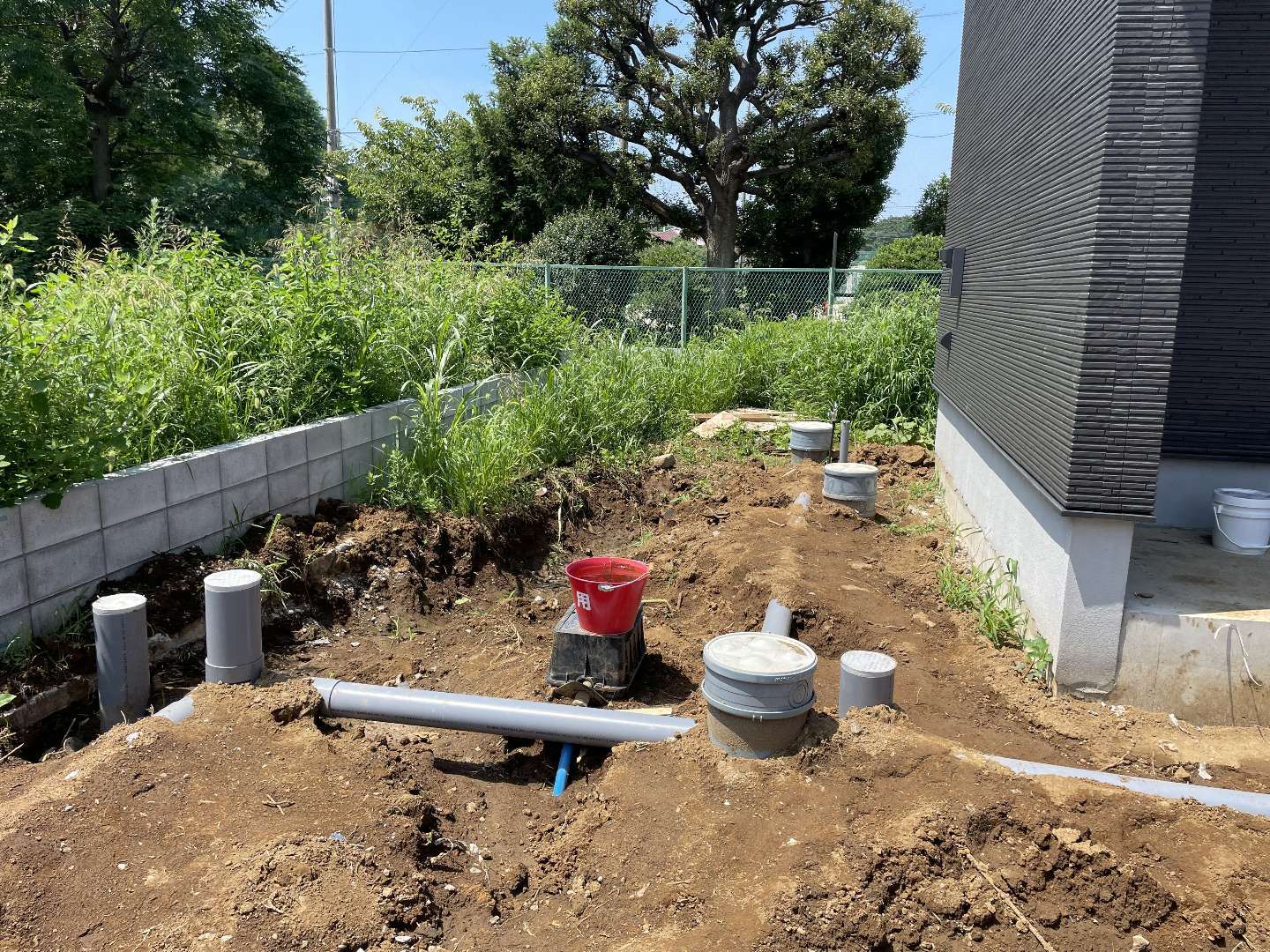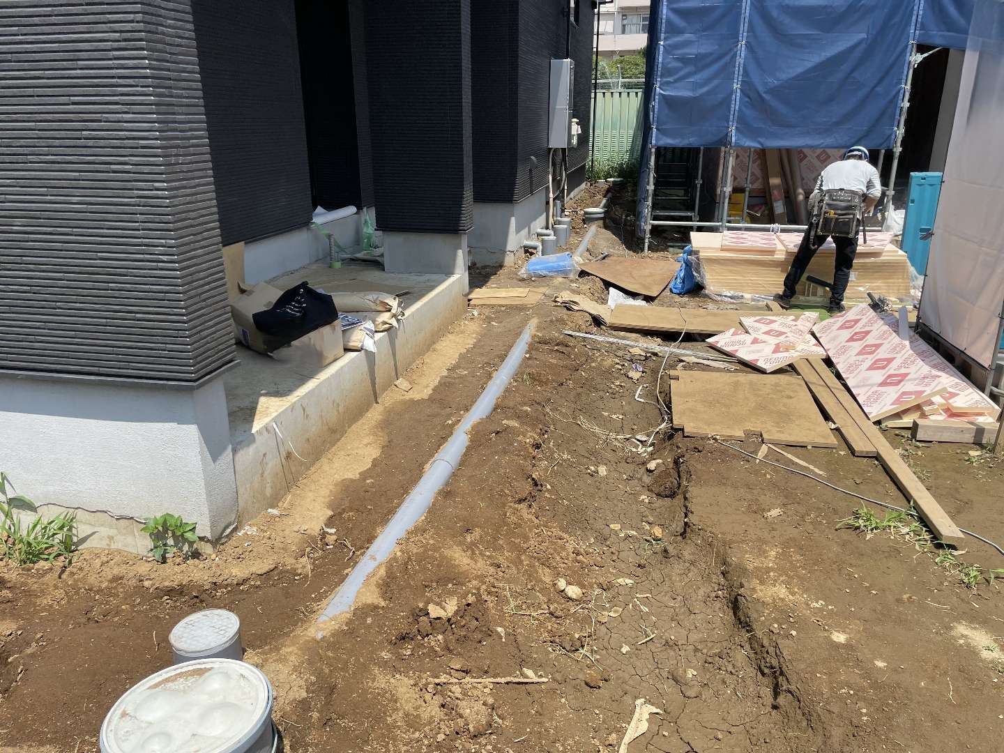 現況路盤が、設計GLよりかなり低い状態で配管がむき出し状態となっており、引き渡しの際には建築の方にて設計GLまで客土された状態から、外構工事の施工となります。