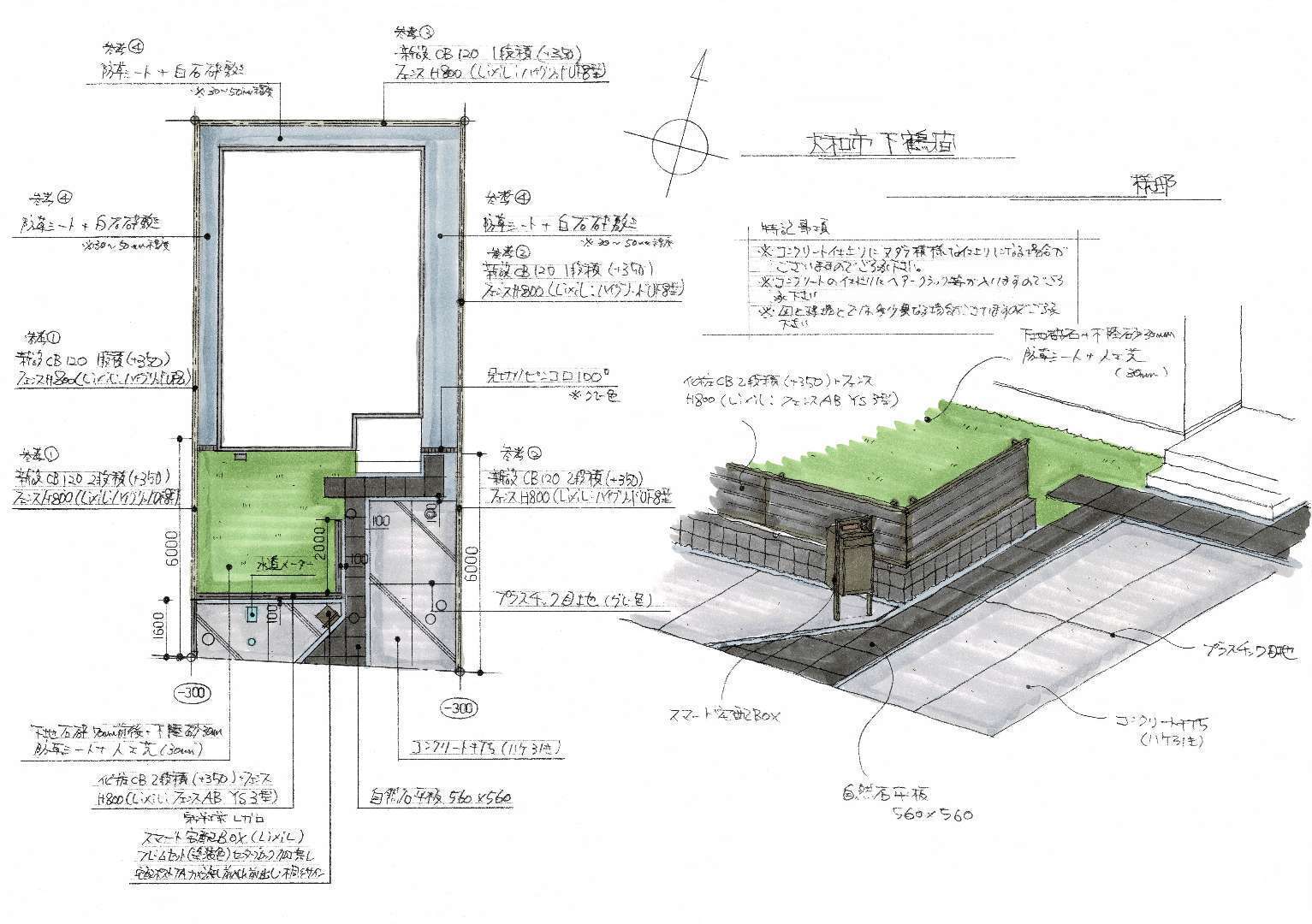 道路より敷地が少し高低差があり、駐車場コンクリートは、玄関ポーチに向かって階段を増設せずに打設し、掃き出し前の部分については、目隠しフェンスにて、道路からの視線を外せるようにと設置いたしました。