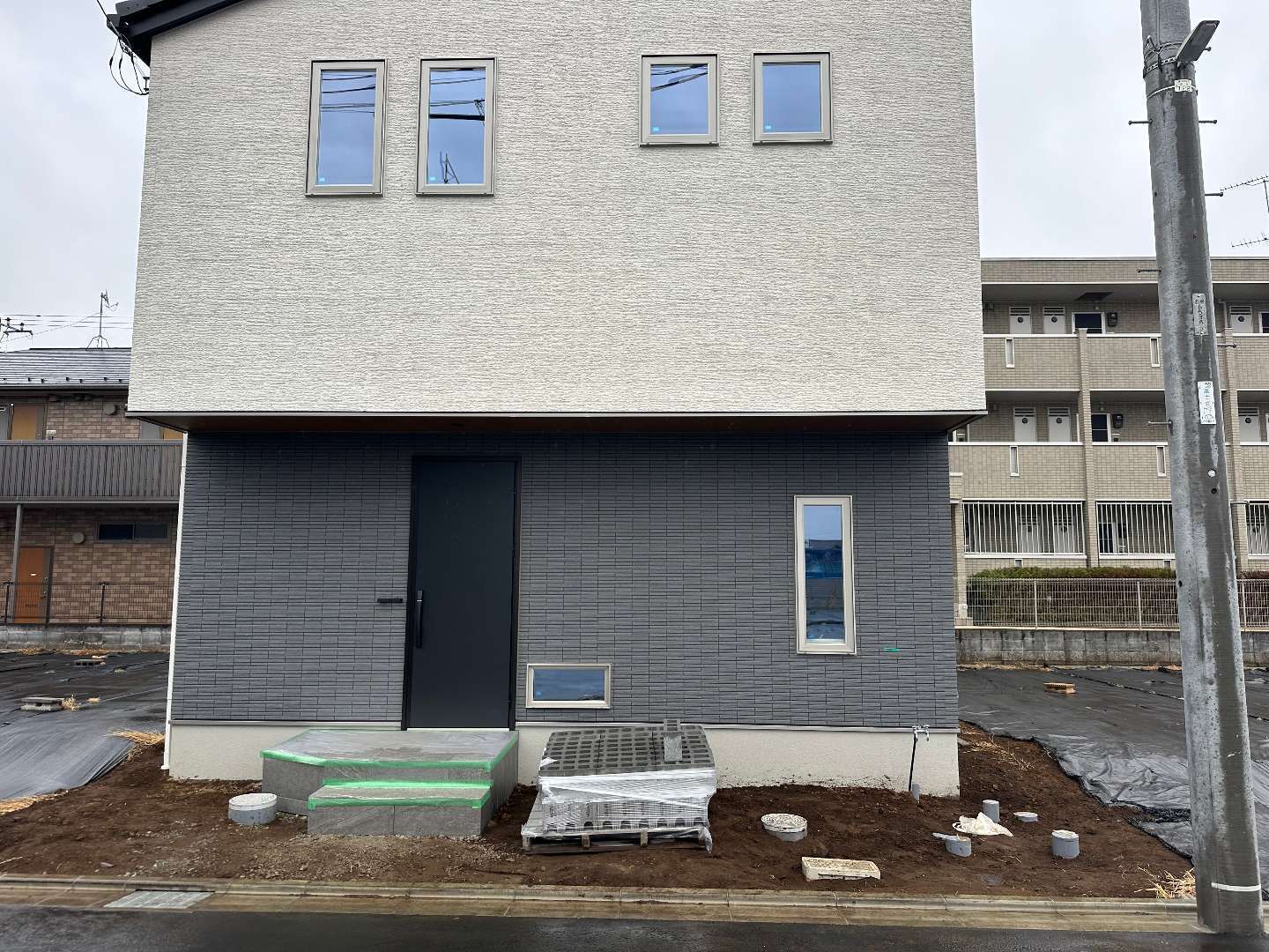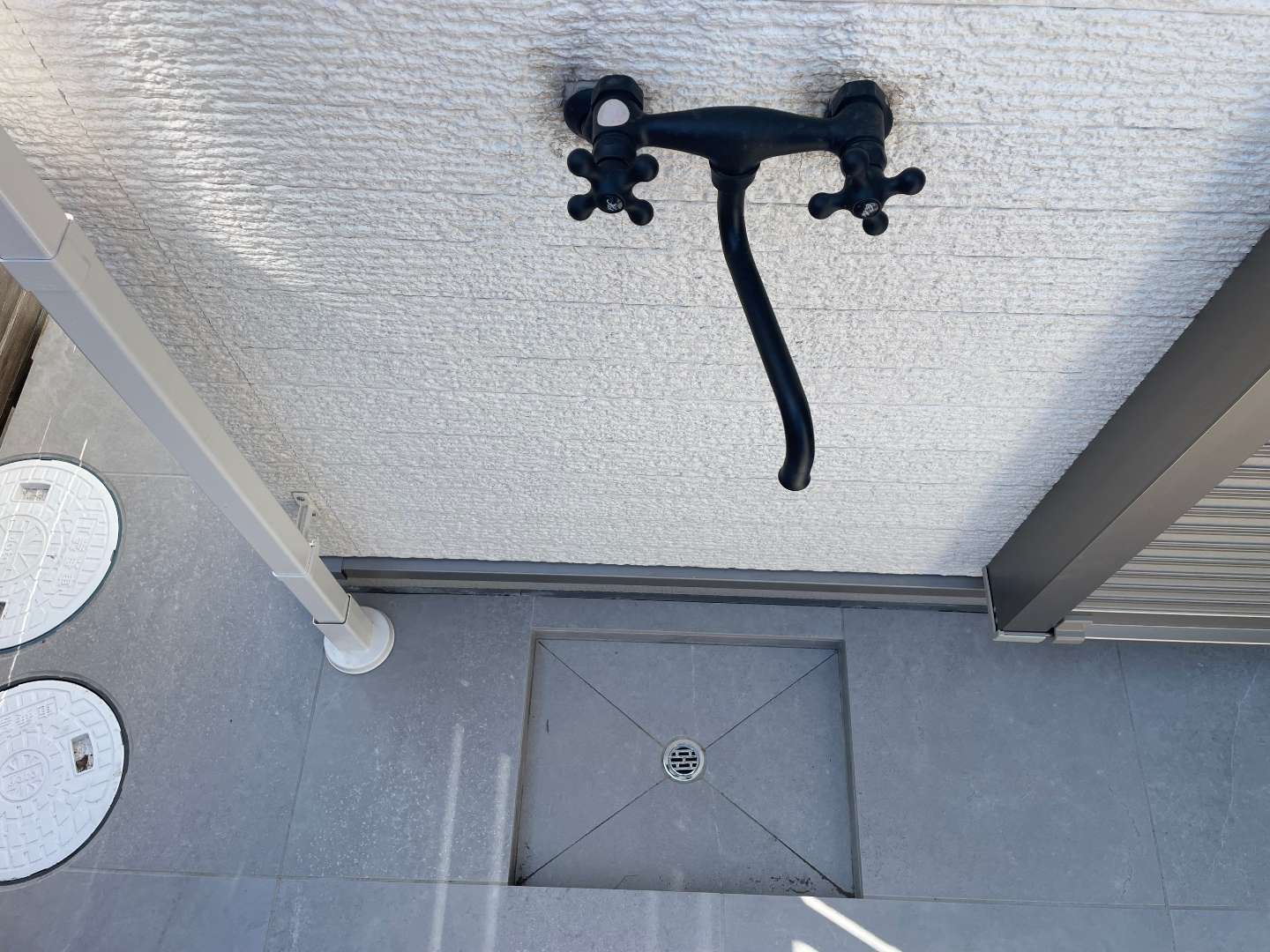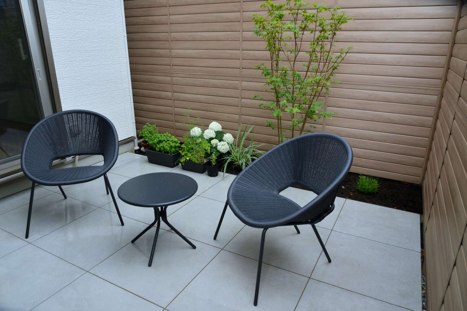 建物裏のリピング前には、目隠しのフェンスとタイルテラスにてプライベート空間を演出ささていただきました。