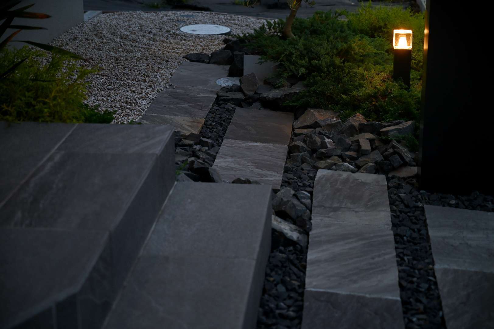 その配植の流れ出、なるべく手入れがいらない様なご提案にて、ゴロタ石、自然石平板と白川砂にて枯山水風をデザインささていただきました。