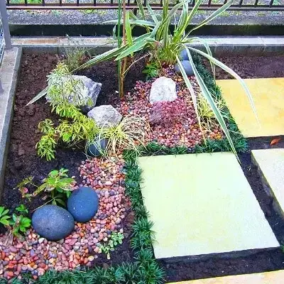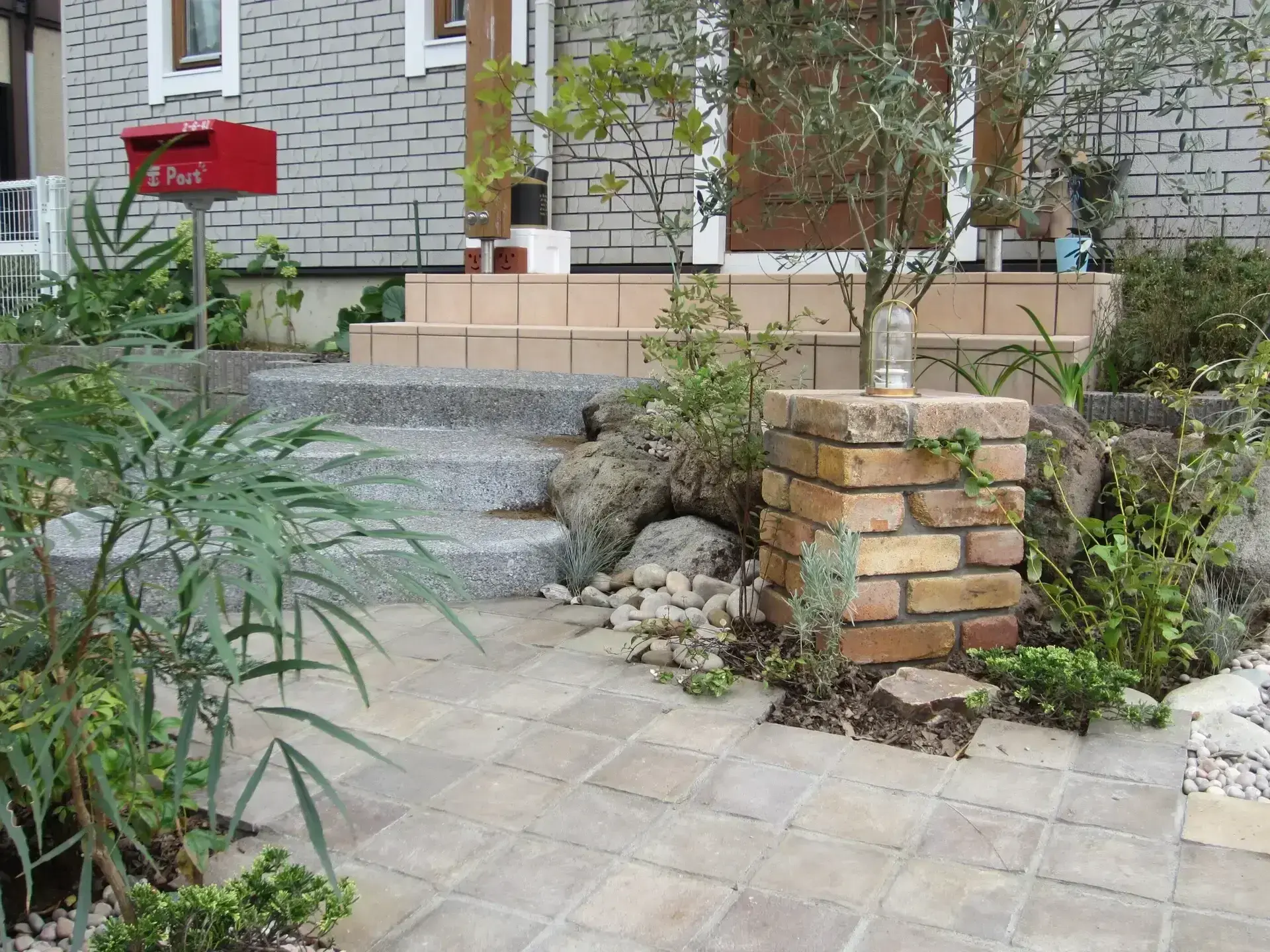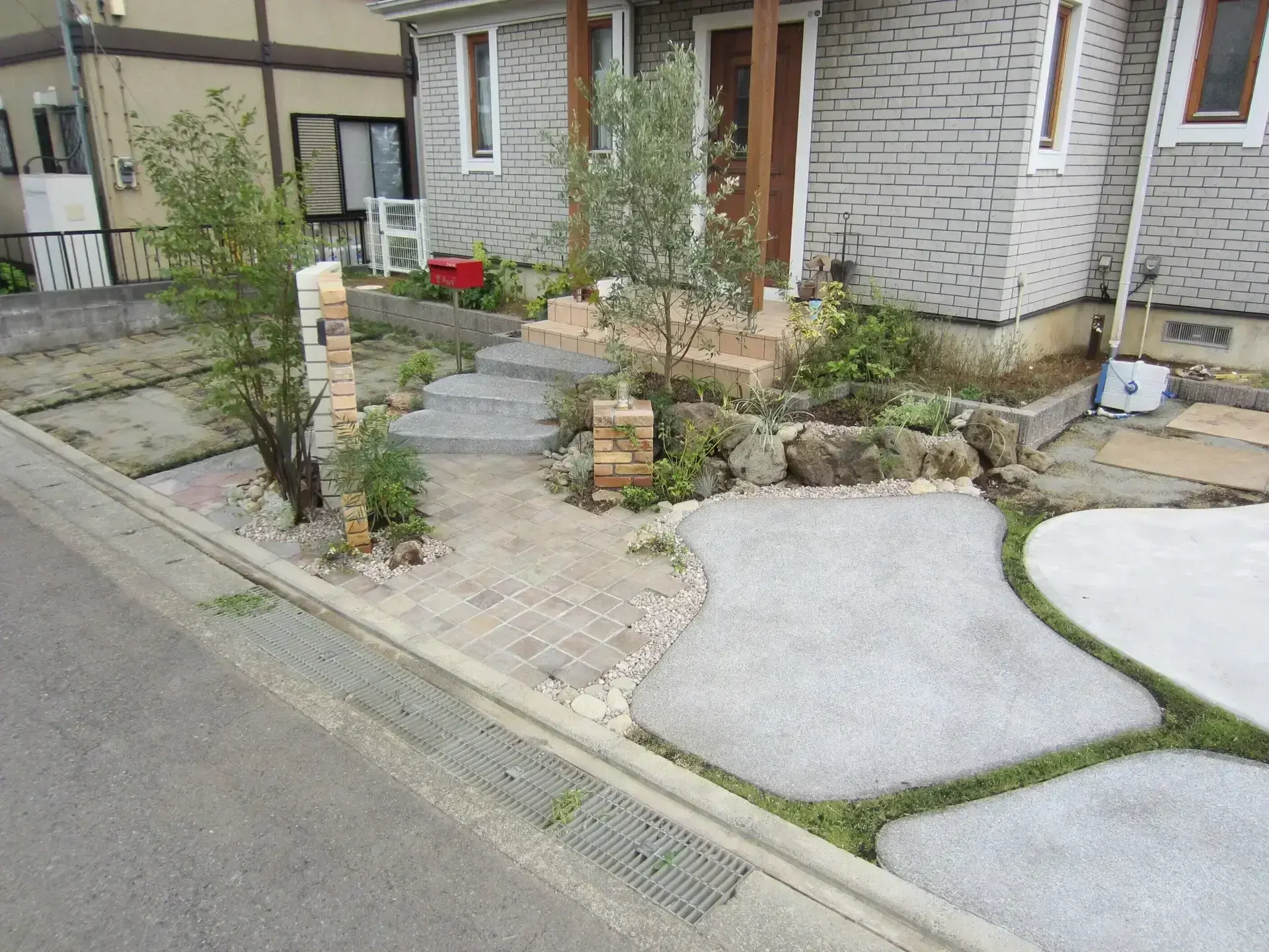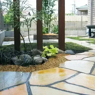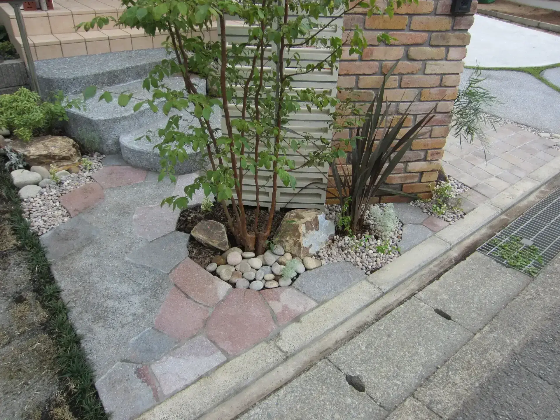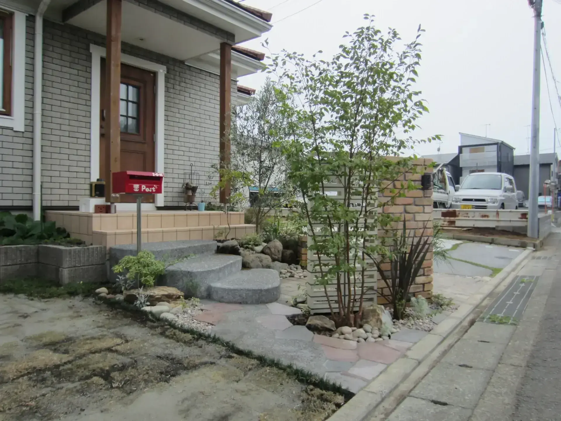 ご新築の際に、枕木で階段・門塀などを造っておりましたが、経年変化と共に朽ちてしまい、使用に不便を感じてのリフォーム外構工事となります。ご要望といたしましては、アプローチ導線の出入りを横からと、緑を多く用いてナチュラルな雰囲気にしたいとの事でした。
