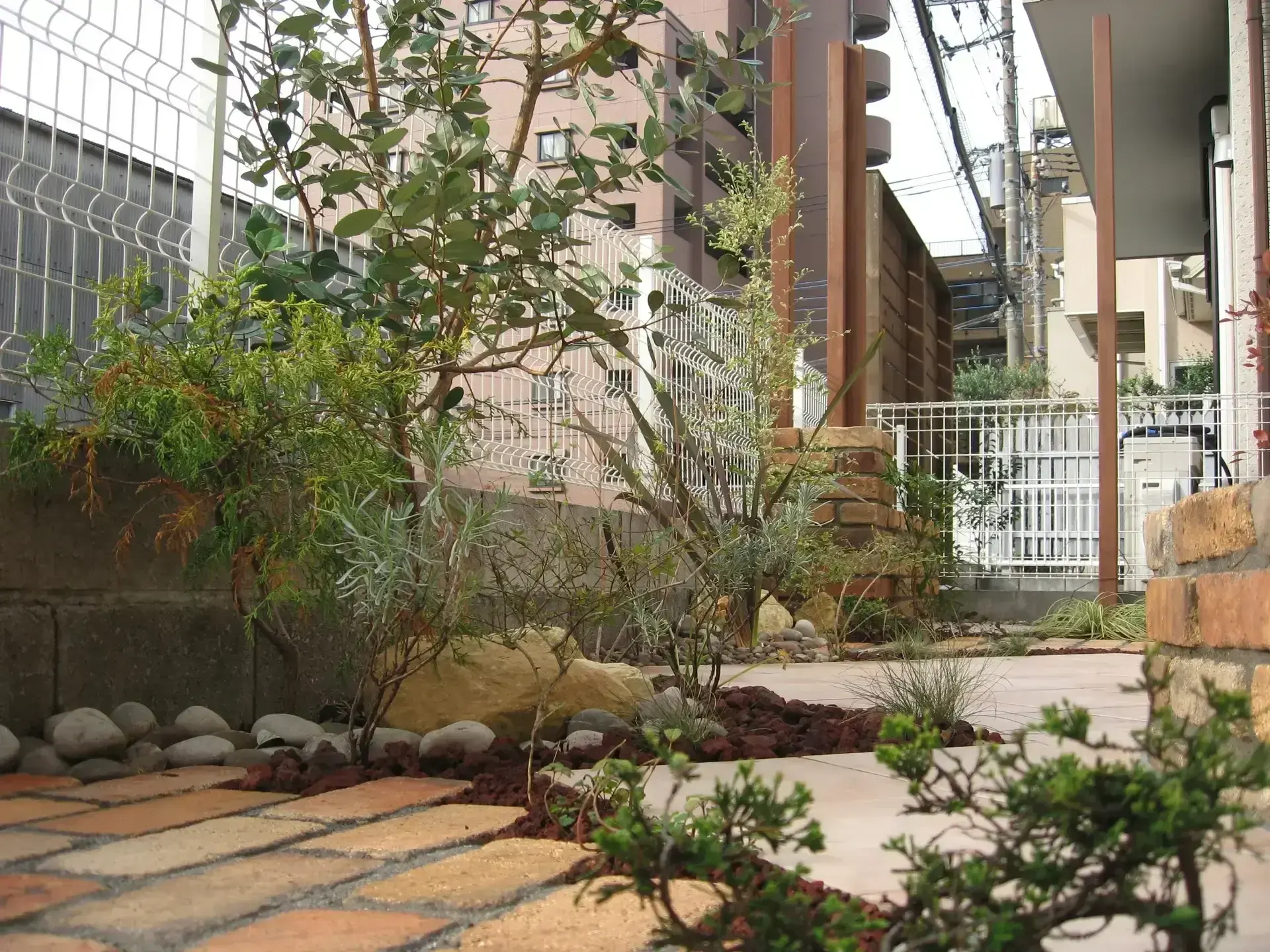 植物に関しましては、メインとなるオリーブ・ヒメシャラを配植し、細かい部分を灌木類とグランドカバーの下草類・砂利とで仕上げました。