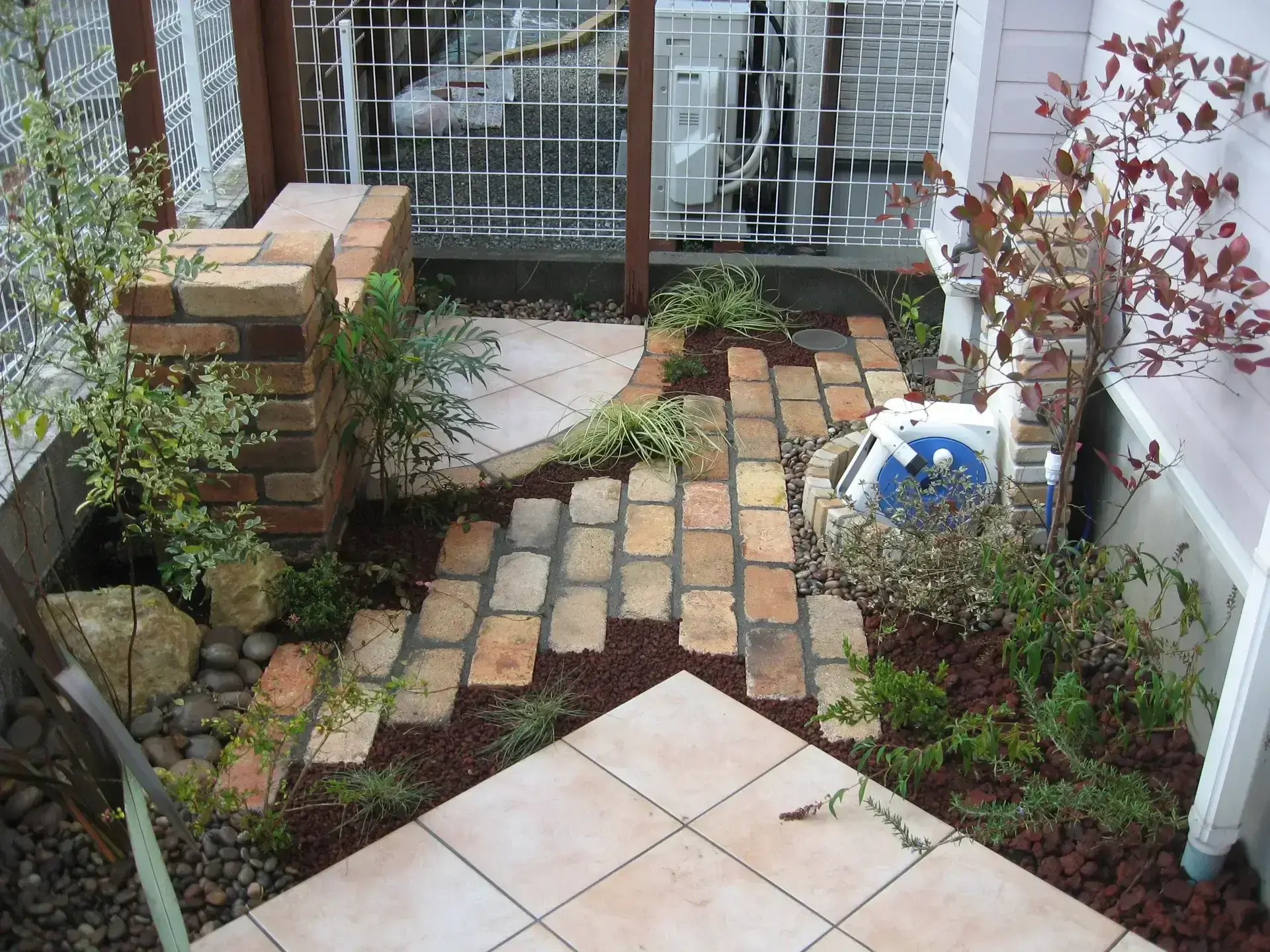 ウッドデッキと、ちょっとした家庭菜園が出来るスペースを造りたいとのご要望でした。縦に長いので、ウッドデッキの設置位置を考慮する必要があり、少し難易度の高い設計でした。